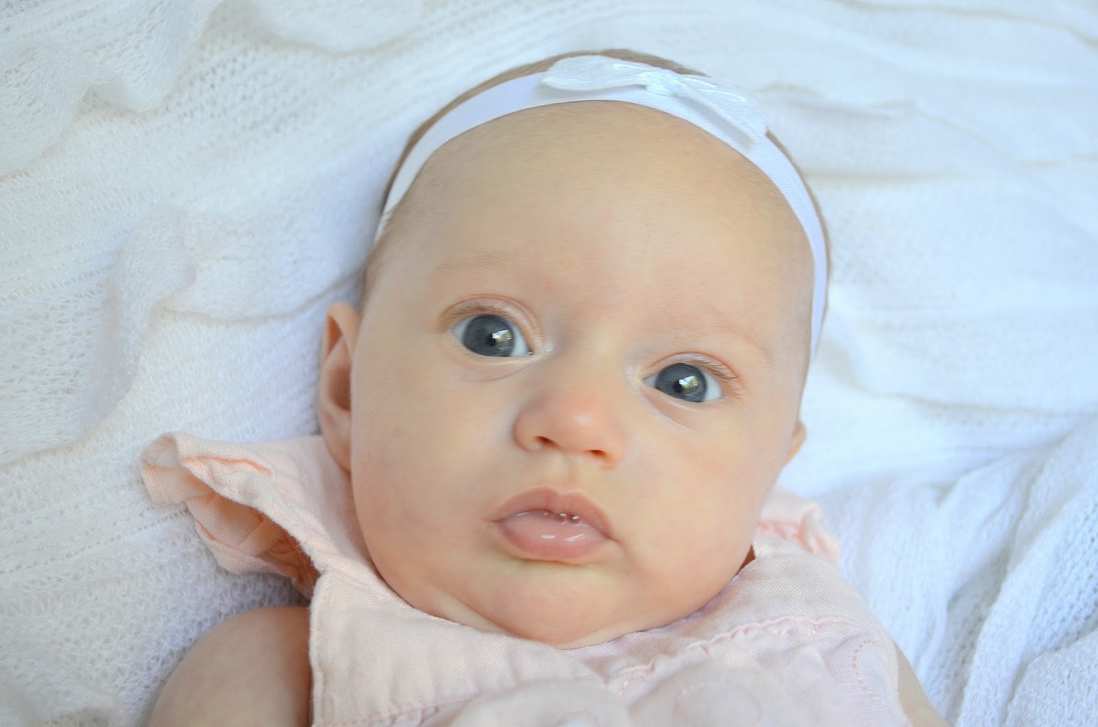 -She is starting to coo and has found her limbs. She has yet to smile (only in her sleep have we seen it) but has a happy smirk and look on her face when we kiss her belly.